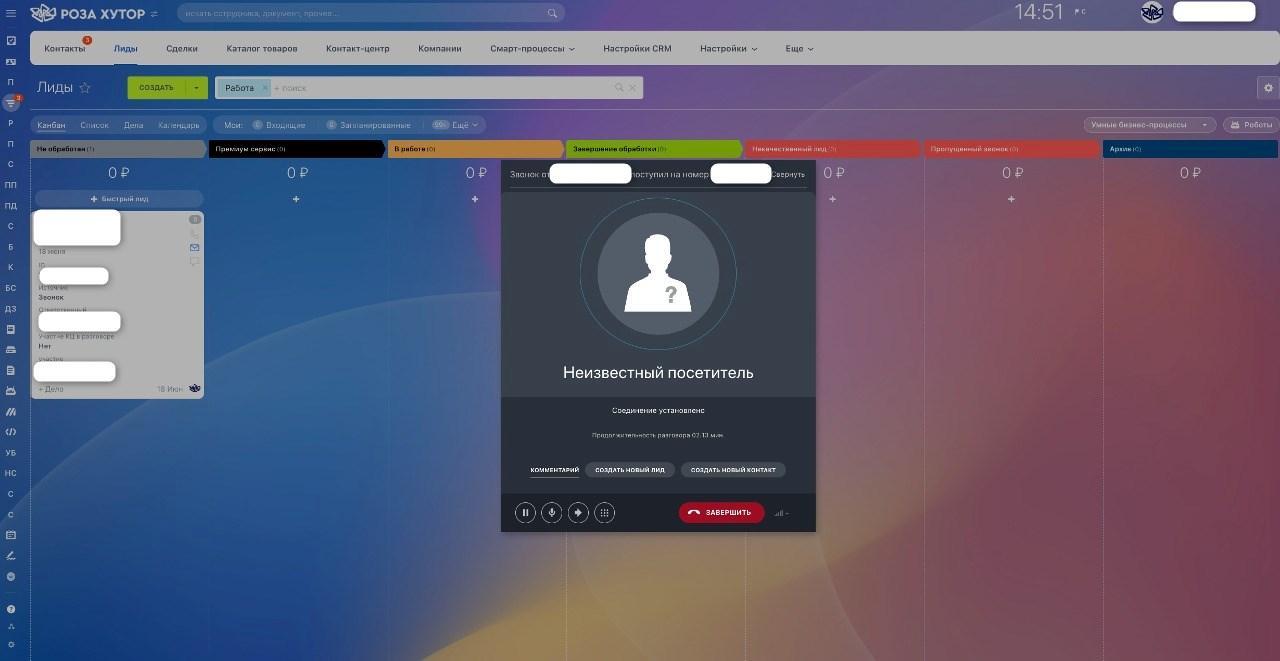 Интерфейс работающей интеграции MANGO OFFICE и CRM в контакт-центре курорта Роза Хутор