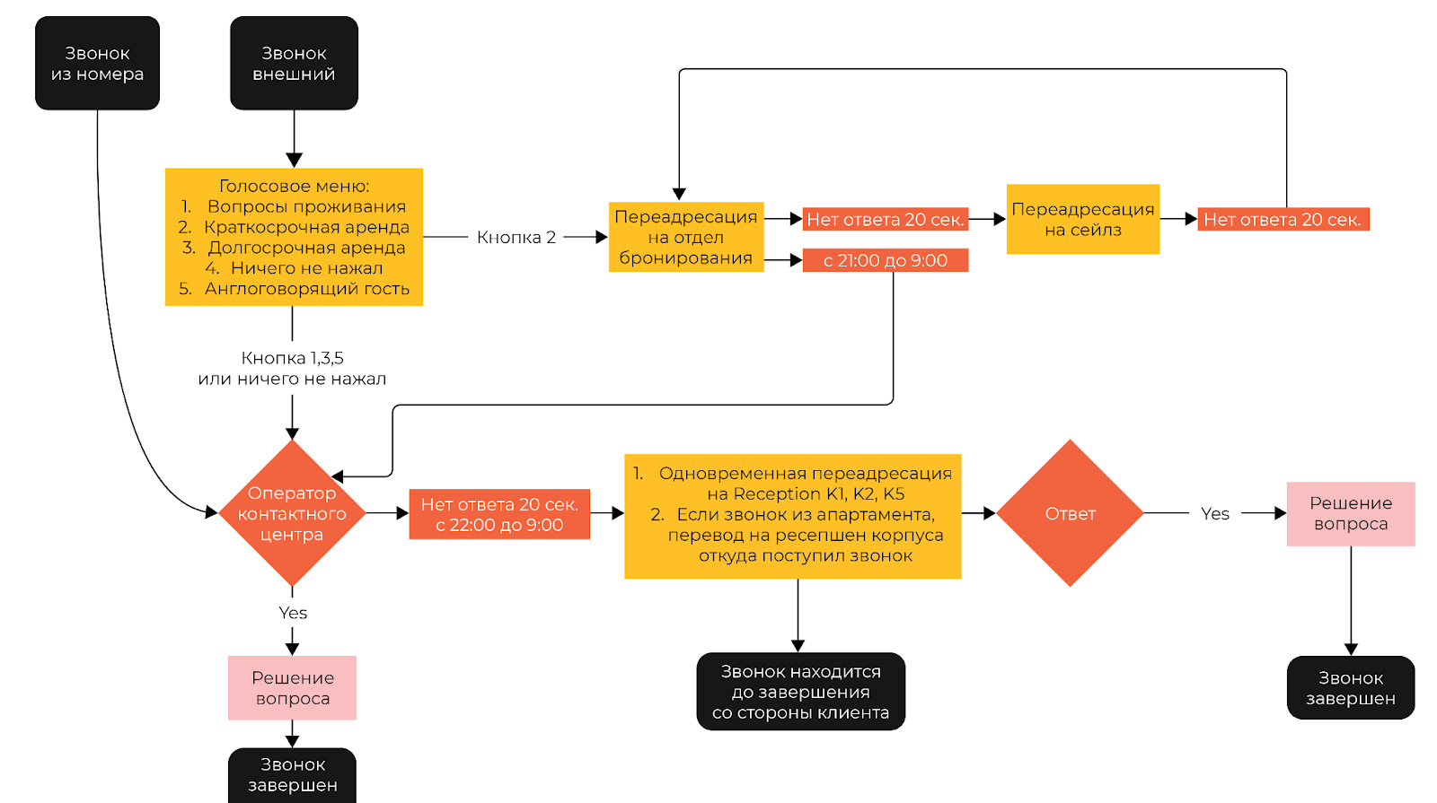 Звонки по разным вопросам поступают в разные отделы. Например — покупка апартаментов или их долгосрочная аренда.